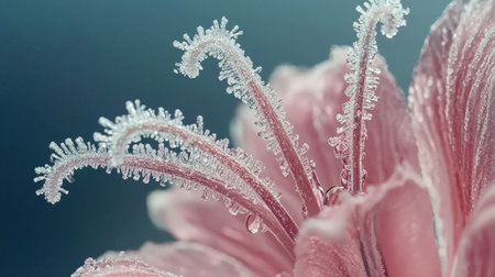 Pink flower adorned with frost, displaying intricate petal details and surrounded by a gentle mist, capturing the essence of winter's beauty and tranquility