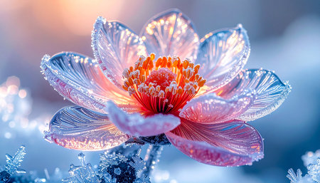 Close-up of a delicate frozen flower with ice-crusted petals, beautifully illuminated by a warm, ethereal light against a cool background.