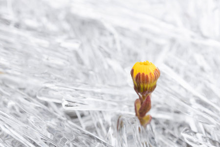 the yellow unopened coltsfoot flower grows straight out of the ice. beautiful delicate flower in ice needles