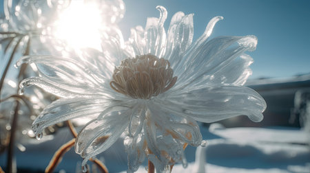 A close-up of a delicate flower encased in ice, showcasing intricate frosted petals and a soft, ethereal glow in a winter setting.