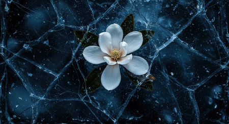 An elegant white magnolia flower with vibrant green foliage is beautifully presented against a background of deep blue, shimmering cracked ice.