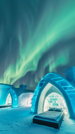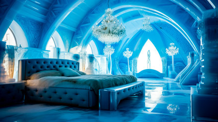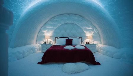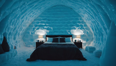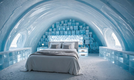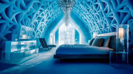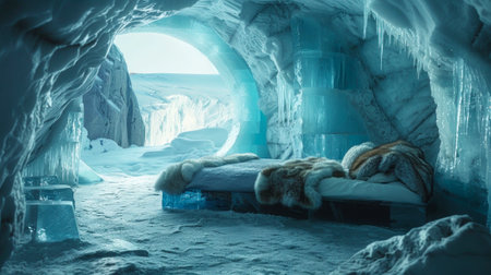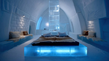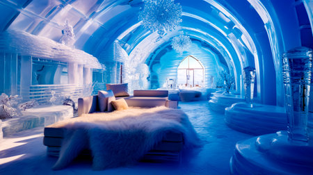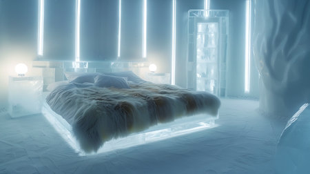 Luxurious Ice Hotel Room with a Large Ice Bed and Soft Fur Blanket Creating a Cozy Ambiance. Concept of Unique Travel Experiences, Winter Hospitality, Luxury Accommodations.