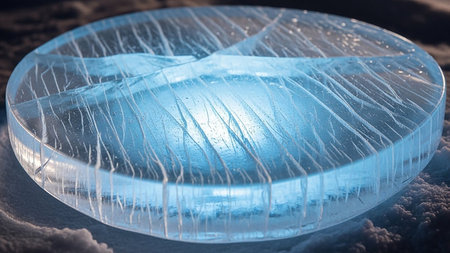 A thick, circular disc of ice with intricate cracks is illuminated by a vibrant blue light emanating from its core, set against a snowy background.