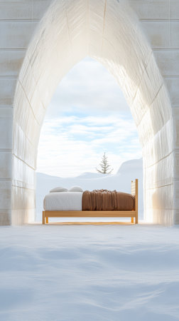 A comfortable wooden bed with soft blankets is placed in an ice arch. Snow covers the ground, and a single tree stands outside in the serene, snowy landscape.