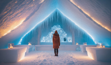 A woman stands in an ice hotel, looking towards a large ice sculpture