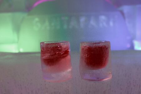 Cocktail short glass made of ice. In Igloo ice bar in winter season.