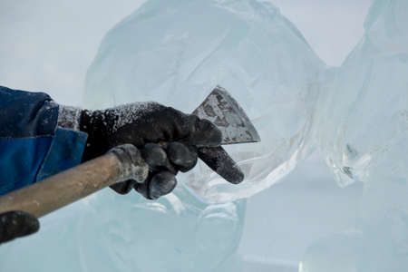 The sculptor cuts an ice figure out of ice with a chisel for Christmas