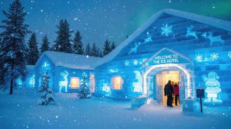 An ice hotel is presented with blue illumination, showcasing exterior architecture at night. The structure is carved with festive shapes. The composition features figures in front of the entrance. This scene is suitable for use in travel promotions and editorial content.