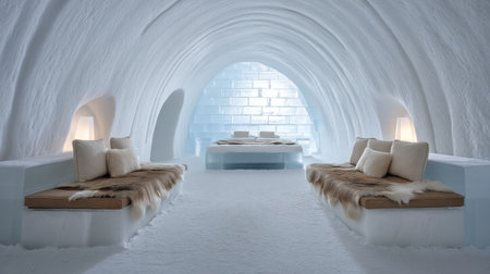 This stunning ice hotel bedroom captures the essence of winter with its elegant design, cozy seating, and soft pillows, evoking a serene escape in a unique icy environment.