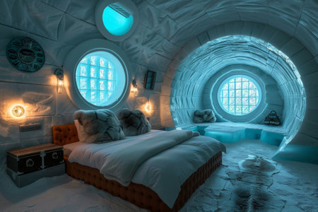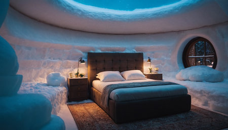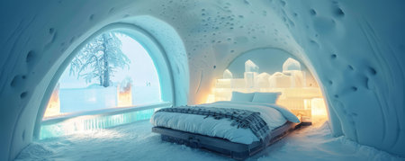 Cozy Bedroom with Plush Fur Blankets and Ice Architecture Overlooking Snowy Landscape. Concept of Winter Wonderland, Unique Lodging, Cozy Retreat. Ice Hotel.