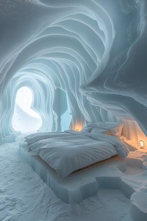 A cozy bedroom carved into ice with warm lighting and modern amenities, set within an Antarctic ice hotel.