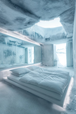 an ice hotel featuring white walls and furniture scattered on the floor, resembling fantasy landscapes. this stunning image, captured by caras ionut, showcases the mesmerizing beauty of norwegian nature. with circular shapes and a hazy, dreamlike quality, this 32k uhd photograph transports you to a magical icy wonderland. ai generated