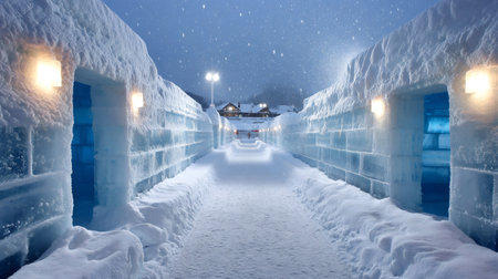 Snow is falling on a pathway lined with ice hotel rooms lit at night