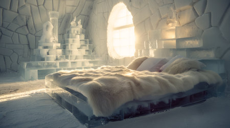 Luxurious Ice Hotel Room with Sunlight Streaming In and a Large Fur-Topped Ice Bed. Concept of winter travel, unique accommodations, and luxury getaway.. Ice Hotel.
