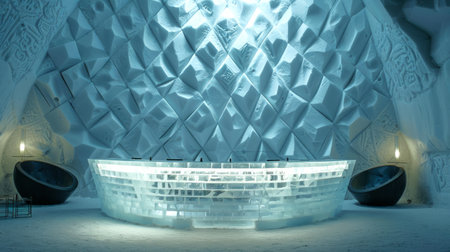 Majestic Ice Bar with Illuminated Counter and Geometric Designs in an Ice Hotel. Concept of Unique Winter Architecture, Icy Interior Design, and Luxurious Cold-Climate Destinations. Ice Hotel.