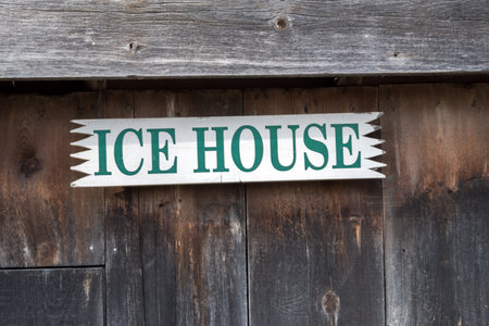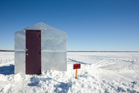 Ice shanty sitting on a frozen lake with a Keep Off The Grass sign juxtaposed against the barren landscape. Copy space in the sky. Concepts could include fishing, humor, nature, solitude, and others.