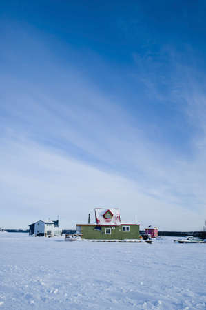 Frozen river adorned with quiet ice fishing huts under a clear winter sky