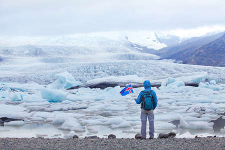 travel to Iceland, tourist in Jokulsarlon glacier lagoon holding icelandic flag, backpacker trip