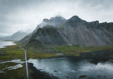 Icelandic landscape with mountains, lake and road in the clouds