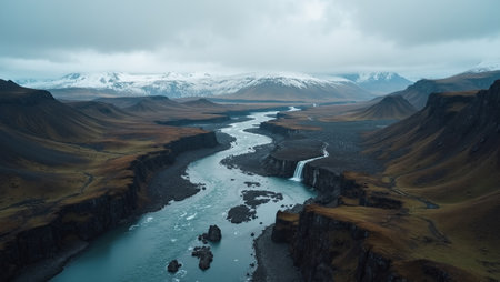 aerial view of river with big cliffs in iceland