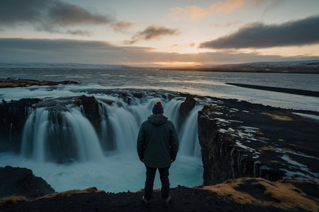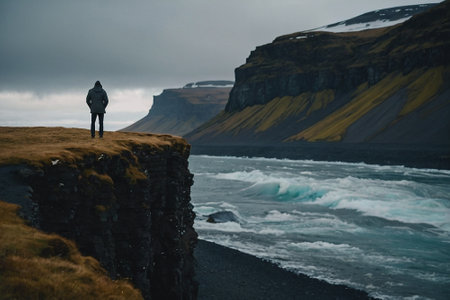Icelandic landscape with a man standing on the edge of a cliff