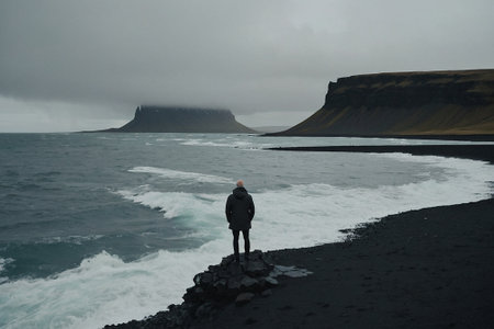 travel to Iceland - man standing at Reynisfjara black sand beach on Atlantic South Coast of Iceland in September