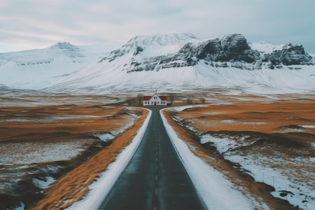 Empty asphalt road on background of snowy landscape in Iceland in winter. Highway road with snow and blue clear sky in Iceland.