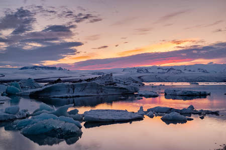 Colorful sunset in Jokulsarlon glacier lagoon in Vatnajokull National Park, Iceland