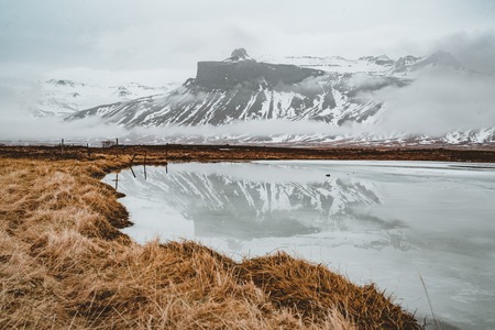 Iceland Mountain reflection with ice and clouds. Snaesfellnes Peninsula