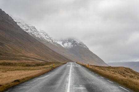 West fjords of Iceland road next to steep mountain slope with snow on top