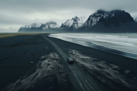 Captivating Winter Wonderland: Majestic Vestrahorn Mountain Blanketed in Snow, Blending Perfectly with a Lone Car on Th_99