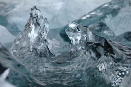 Pieces of clear blue ice of lake Baikal in the winter sunlight. Beauty of nature
