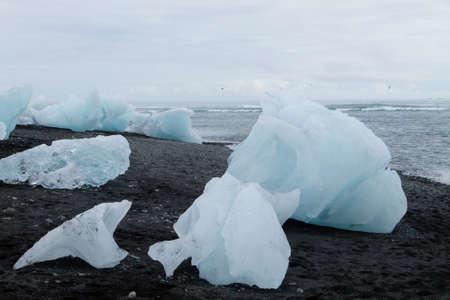 Chunks of ice washed up on shore of the ocean near the Glacial lake Jokulsarlon in Iceland