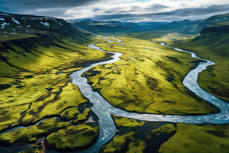 Generative AI : Aerial view of a beautiful landscape with volcano craters and high mountains near Holmsarfossar Iceland