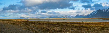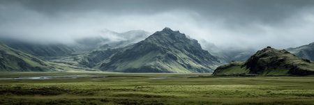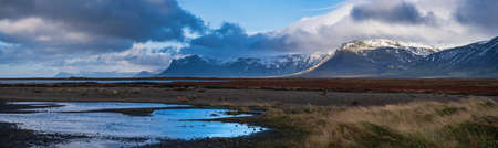 Icelandic landscape with mountains and clouds. Panoramic view