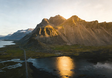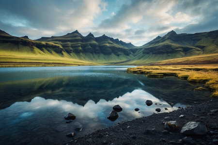 the photo captures a stunning sunrise over the kordano mountain in the iceland mountains. in the style of delicately rendered landscapes by richard misrach, this uhd image by erik johansson showcases rectangular fields in light green and light amber hues. the calm waters add to the serene beauty of the scene. ai generated