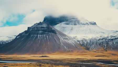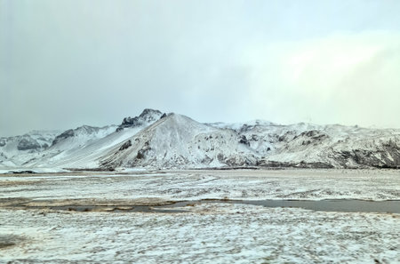 Snow covered mountains rise above a frozen plain in the icelandic countryside, creating a serene winter scene