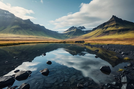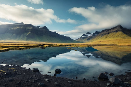 Icelandic summer landscape. Reflection of mountains in the lake.