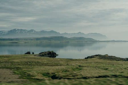 Colorful Icelandic landscapes under gray heavy sky. Green wet grass, beautiful lake, and snowy tops of the mountais reflected in the lake water. Kirkjufellsfoss, Snaefellsnes peninsula.