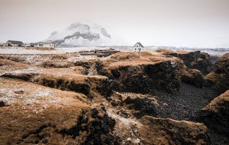 Icelandic landscape with a white small beautiful house in winter under the mountain at Arnarstapi village snaefellsness peninsula, Iceland
