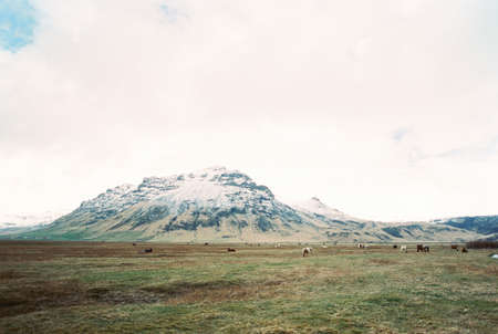 Horses graze in the valley against the backdrop of the mountains. Iceland
