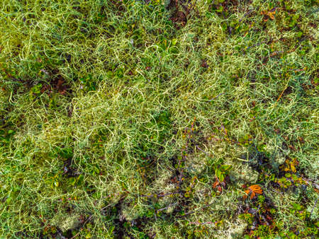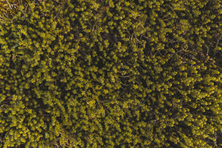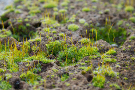 Fresh green and yellow moss with blurred background. Close up view with a small depth of field far away. Stock photography of forest green and yellow moss