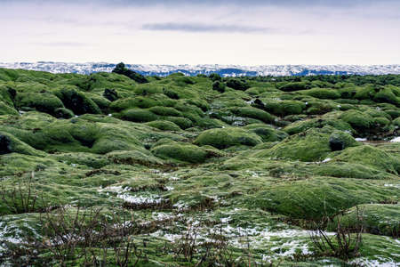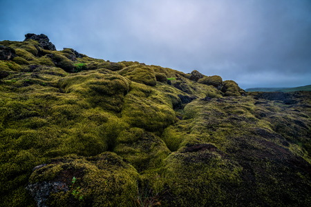 Volcanic lava field covered with green moss in the rural of Iceland. View of mossy lave field in summer season in Iceland