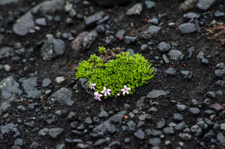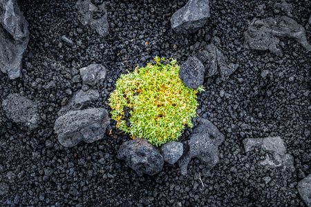 Green bush between volcanic rocks of the Mount Etna in Sicily, Italy