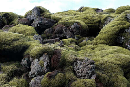 Icelandic landscape with volcanic rocks and moss Horizontal