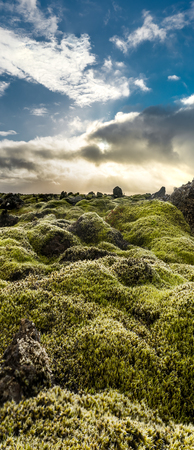 Icelandic fields of lava covered with moss panorama, South Iceland