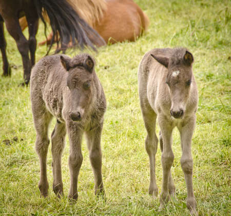Icelandic Wild brown horses in country side, field