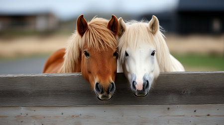 Two beautiful horses with flowing manes interact at a wooden fence in a serene countryside setting
