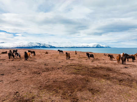 Icelandic horses in the field of scenic nature landscape of Iceland. The Icelandic horse is a breed of horse locally developed in Iceland as Icelandic law prevents horses from being imported.