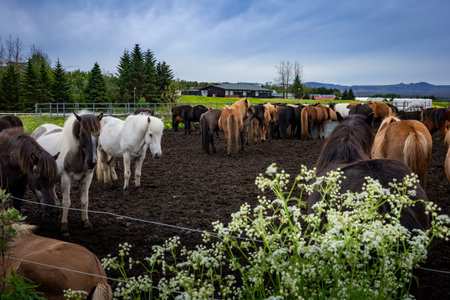 Herd of precious Icelandic horses gathered in a farm.